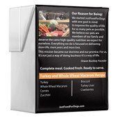 Not only can dogs eat pasta—they love it, too! JustFoodForDogs Pantry Fresh Turkey & Whole Wheat Macaroni is made with ground turkey, whole wheat macaroni, carrots, zucchini, broccoli, turkey liver, and cranberries. This fully balanced, nutritious diet is ideal for adult dogs, active dogs, large-breed dogs, underweight dogs, and picky eaters. Thanks to its innovative Tetra Pak packaging, every Pantry Fresh meal can be stored unopened on the shelf for up to two years from the manufacture date, making it the perfect option when traveling or boarding your dog. This isn’t your typical turkey dog food, it’s real food for real good dogs.